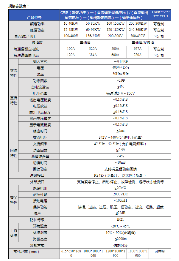 CWDZ系列回饋式直流電子負(fù)載采用DC/DC式控制技術(shù)加PWM逆變技術(shù),和雙DSP控制核心,能實(shí)現(xiàn)高性能全功率段能量回饋電網(wǎng)功能,相比常規(guī)直流負(fù)載,更節(jié)能,更綠色環(huán)保。數(shù)字控制技術(shù),高控制精度,響應(yīng)速度快,負(fù)載電壓范圍寬,可實(shí)現(xiàn)24V至滿量程電壓的全范圍負(fù)載輸入。