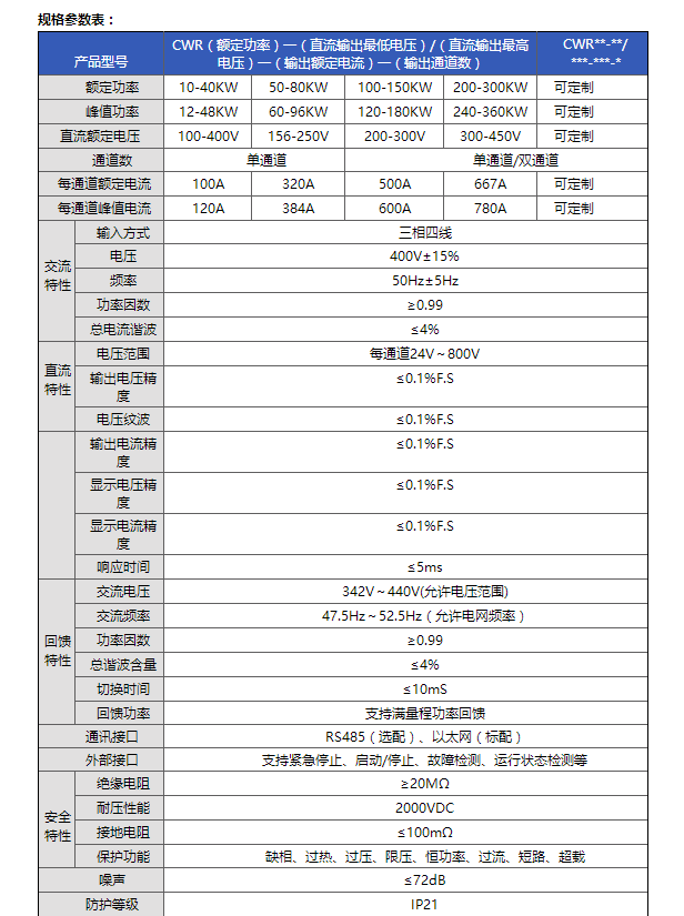 CWR系列可編程高精度智能雙向直流電源,其直流輸出特性具有完全電氣隔離、高精度、高動態(tài)響應(yīng)及高可靠性等特性,并具有智能雙向能量轉(zhuǎn)換和可向電網(wǎng)回饋能量功能,DC/DC側(cè)采用載波移相電路,全數(shù)字控制,調(diào)節(jié)精度高,響應(yīng)速度快,輸出調(diào)節(jié)范圍廣。輸出具有可編程功能,可適用于新能源汽車行業(yè)的驅(qū)動電機、電機控制器、PCS(儲能電池組)和雙向充電機的測試及老化供電等。